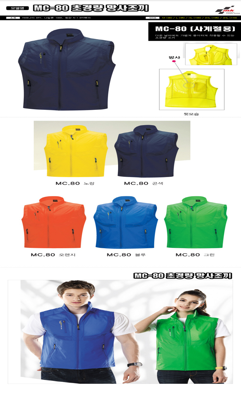 • •Size : M, L, XL, 2XL, 3XL •소재 : 15데니아 DTY, 나일론 100%, 등판 5:1 DTY매쉬 ※단가변동 있을 수 있습니다. 제품 색상은 인쇄된 것이므로 실제 제품과 다소 차이가 있을 수 있습니다. ※MC-80