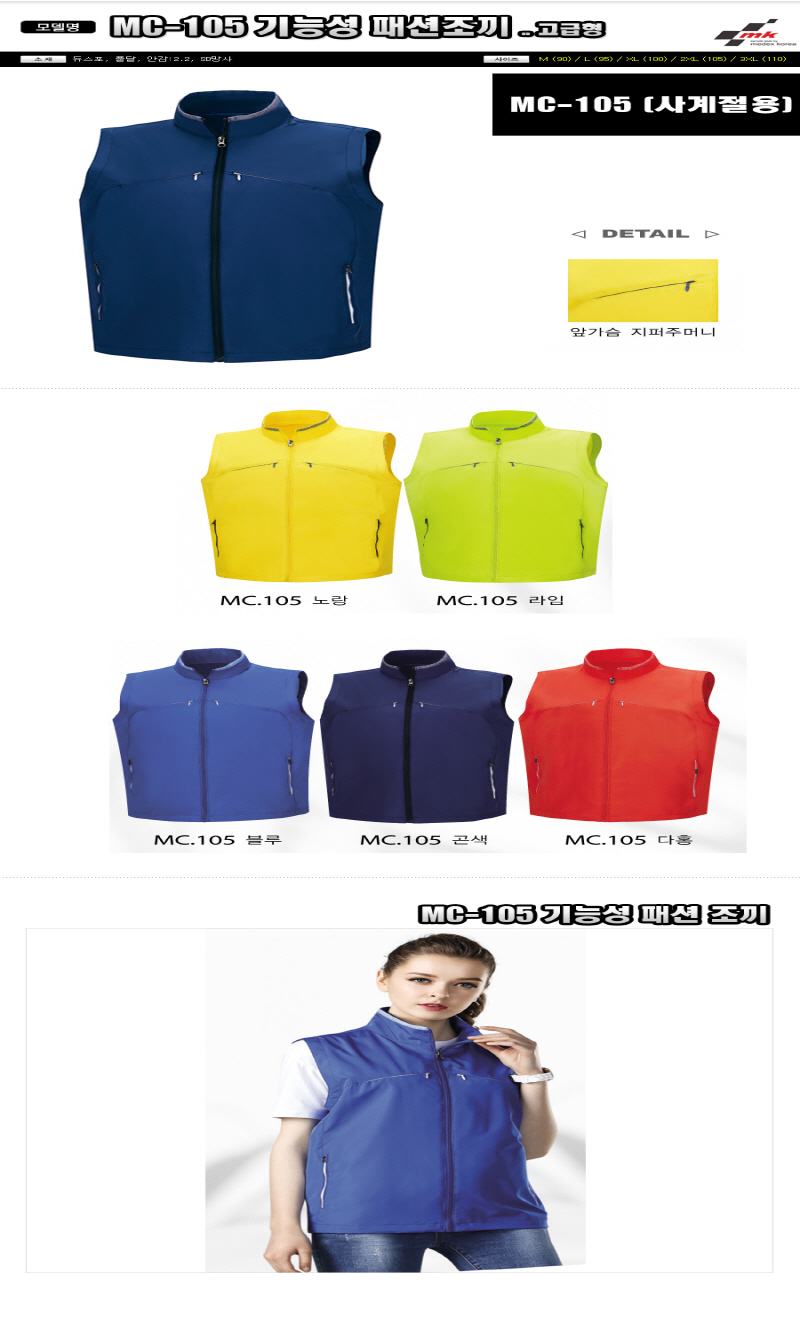 •Size : M, L, XL, 2XL, 3XL •소재 : 듀스포 풀달, 안감 : 2:2 SD망사 ※단가변동 있을 수 있습니다. 제품 색상은 인쇄된 것이므로 실제 제품과 다소 차이가 있을 수 있습니다. MC-105