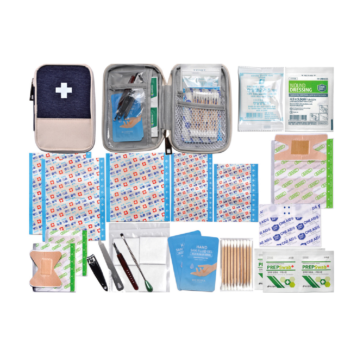 미용세트(손톱깎기,네일파일(손톱연마기),큐티클깎기,귀이개)/표준밴드8p/ 대형밴드2p/사각밴드2p/미니밴드4p/손끝밴드2p/관절밴드2p/방수밴드2p/ 알콜솜4p/4p절솜/드레싱밴드/멸균거즈5p/손소독제2p/10p면봉/구급케이스 ※밴드이미지는 변경될수있음 / 종이케이스 포함