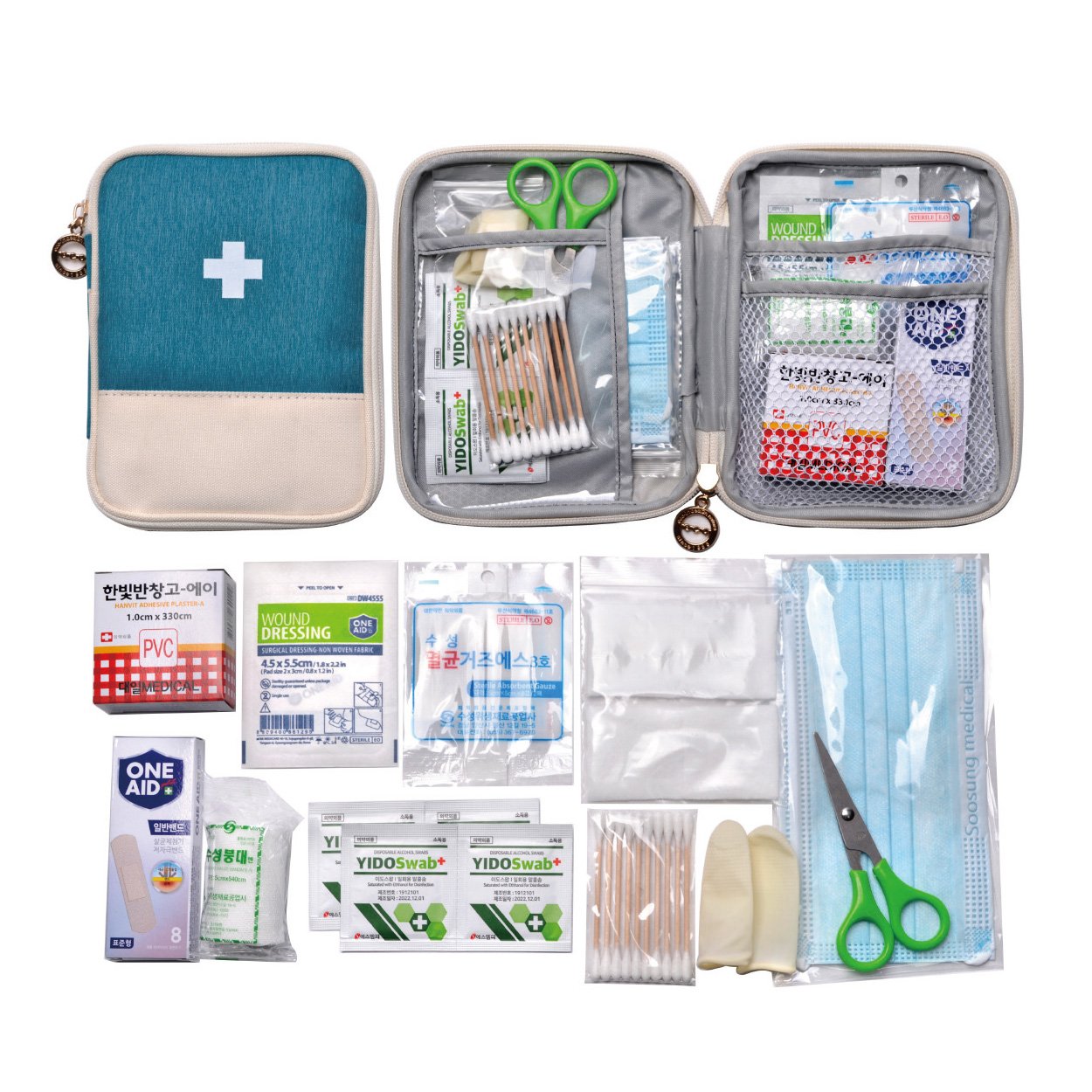 반창고/붕대소/밴드8P/지샤크2p/일회용마스크/가위/알콜솜4p/드레싱밴드/ 멸균거즈2p/10p면봉/절솜4P/구급케이스 ※밴드이미지는 변경될수있음 / 종이케이스 포함