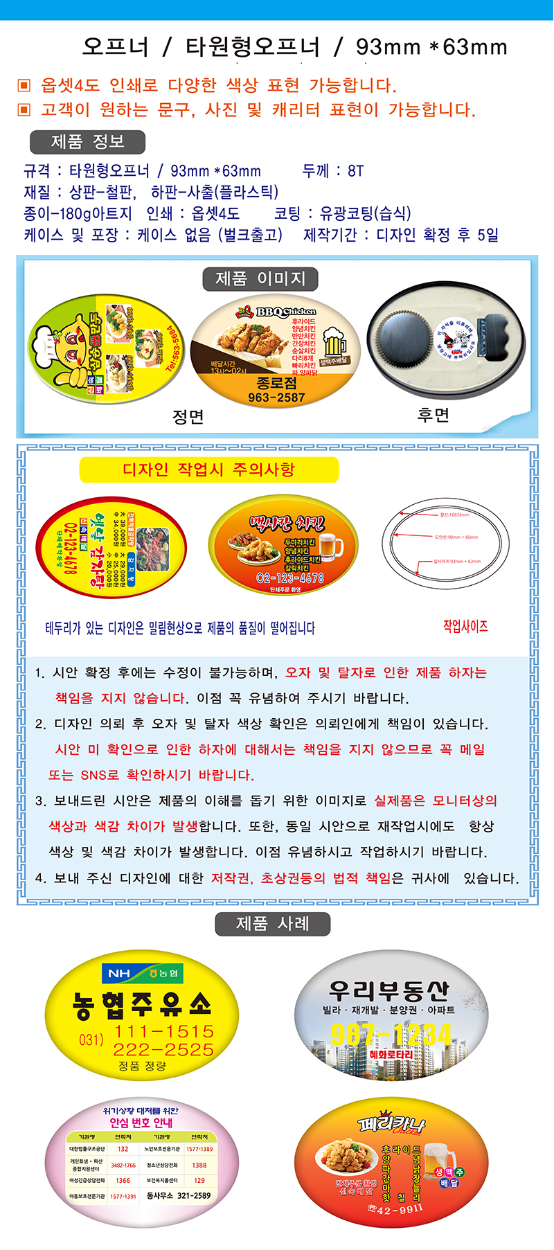 •1,000EA •도안선:90mmx60mm •칼 선:106mmx76mm 제품 상세 설명 / - 재질 : 철판 / 옵셋인쇄 (유광코팅) - 케이스 및 포장 : 케이스 없음 (벌크출고) - 제작기간 : 디자인 확정 후 5일