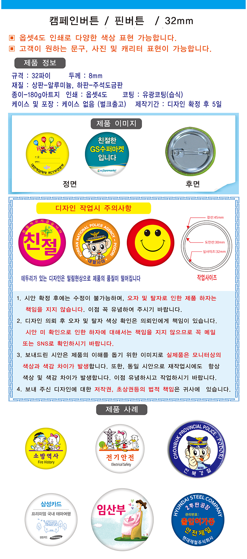 •1,000EA •기본수량 : 100EA •1,000개 이하 가격 별도 문의 •재질:철판/옵셋인쇄(유광코팅) •케이스 및 포장 : 케이스 없음(벌크출고) •제작기간:디자인 확정 후 5일