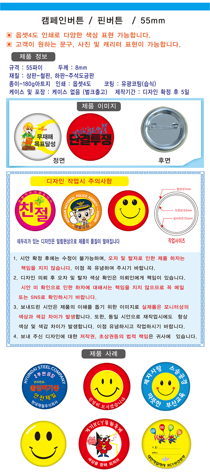 •1,000EA •기본수량 : 100EA •1,000개 이하 가격 별도 문의 •재질:철판/옵셋인쇄(유광코팅) •케이스 및 포장 : 케이스 없음(벌크출고) •제작기간:디자인 확정 후 5일