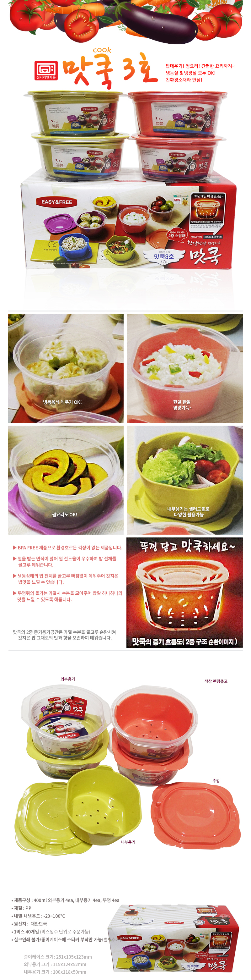 • 구성 : 400ml외부용기+내부용기*4 • 1Box 40ea입 ※ 전자레인지용 용기제품, 조리도구세트 박스입수 단위로 주문가능 / 인쇄불가 종이케이스위 스티커부착 별도추가