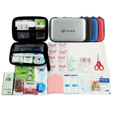 •알콜스왑 8매, 밴드세트, 붕대小, 면봉세트, 반짇고리, 치간잇실 3개, 면 봉세트, 면반창고, 알콜스틱, 수면안대, 방수밴드 2매, 멸균거즈, ,렌 즈케이스, 가위, 위생마스크 3매, 드레싱밴드, 아트케이스